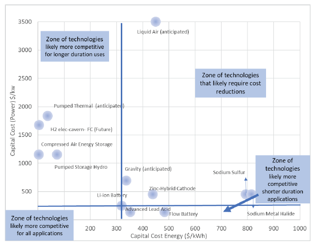 需要注意的是,對于大多數(shù)儲能技術來說,這些與功率和能源相關的組件之間的區(qū)別并不是絕對的,而且區(qū)分開這些組件可能很困難。圖4中未說明許多其他重要因素,包括充放電往返效率和潛在選址限制。