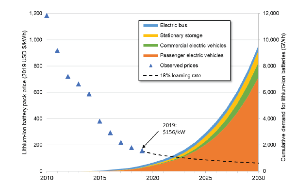 圖2.鋰離子電池的成本在過去十年下降了80%以上,并且預計在受到電動汽車需求推動的持續(xù)生產規(guī)模的基礎上將會繼續(xù)下降。