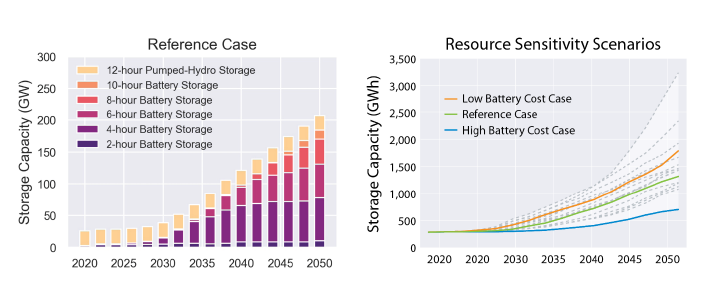 圖1.參考案例中美國到2050年部署的儲能系統(tǒng)裝機容量將增長到約200GW,部署的持續(xù)時間范圍(左)意味著儲能系統(tǒng)儲能容量約為1,200GWh(右),其部署范圍廣泛。