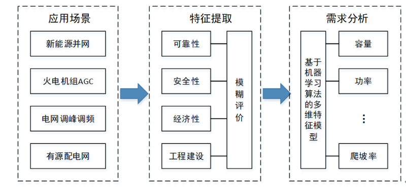 最后,根據(jù)提出的應(yīng)用場(chǎng)景特征參數(shù),構(gòu)建的典型應(yīng)用場(chǎng)景模型,采用機(jī)器學(xué)習(xí)方法建立典型應(yīng)用場(chǎng)景的仿真模型,分析應(yīng)用場(chǎng)景特征與電力系統(tǒng)運(yùn)行參數(shù)之間的對(duì)應(yīng)關(guān)系,揭示場(chǎng)景特征量與儲(chǔ)能參數(shù)和特性需求的函數(shù)關(guān)系。