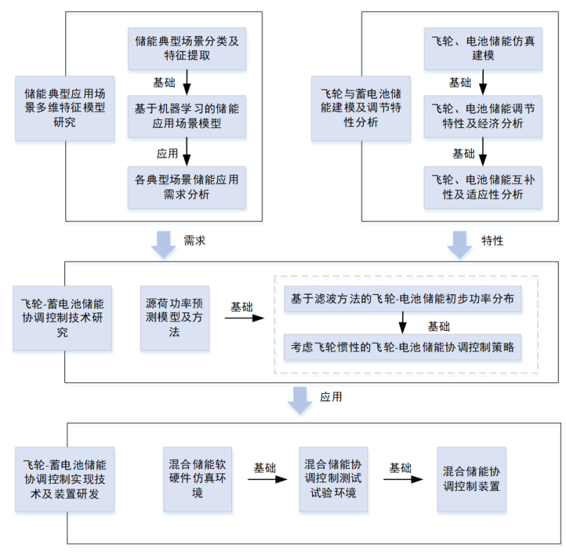 飛輪-電化學(xué)復(fù)合儲(chǔ)能關(guān)鍵技術(shù)及示范應(yīng)用分為四個(gè)研究?jī)?nèi)容開展工作,技術(shù)路線如下圖所示。首先構(gòu)建儲(chǔ)能典型應(yīng)用場(chǎng)景的多維度特征模型,揭示場(chǎng)景特征量與儲(chǔ)能參數(shù)和特性需求的函數(shù)關(guān)系,精準(zhǔn)描述應(yīng)用場(chǎng)景對(duì)儲(chǔ)能參數(shù)和特性的需求;其次,建立飛輪和電化學(xué)電池儲(chǔ)能的仿真模型,分析飛輪與電池儲(chǔ)能的技術(shù)和經(jīng)濟(jì)特性;接著,研究飛輪與電化學(xué)電池儲(chǔ)能的協(xié)調(diào)控制策略,提升混合儲(chǔ)能系統(tǒng)的調(diào)節(jié)性能、運(yùn)行安全性和經(jīng)濟(jì)性;最后,在上述模型與方法基礎(chǔ)上,研究飛輪-電化學(xué)混合儲(chǔ)能協(xié)調(diào)控制架構(gòu)、集成方案等實(shí)現(xiàn)技術(shù)。