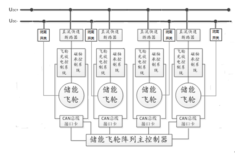 并聯(lián)儲(chǔ)能飛輪陣列均衡控制策略,包括儲(chǔ)能飛輪、飛輪充放電控制系統(tǒng)、磁軸承控制系統(tǒng)、快速直流斷路器、儲(chǔ)能飛輪陣列主控制器、CAN總線接口和公共直流母線。