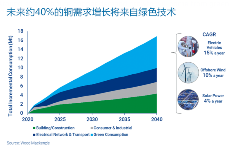 銅的使用基于其延展性、傳熱性和抗菌特性。加之良好的導(dǎo)電性能,我們預(yù)計(jì),未來(lái)40%的需求增長(zhǎng)將來(lái)自綠色技術(shù)中的電力應(yīng)用,包括電動(dòng)汽車、海上風(fēng)電和光伏設(shè)備。