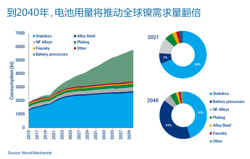 雖然不銹鋼仍將是鎳的主要用途,但未來(lái)20年需求增長(zhǎng)的主要來(lái)源將是電池。伍德麥肯茲預(yù)計(jì),至2040年,鎳需求量將翻一番,達(dá)到每年600萬(wàn)噸。其中,電池鎳用量占總用量的占比將從2021年的7%增長(zhǎng)到2040年的40%。