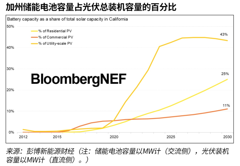 彭博新能源財經(jīng)還預(yù)計,到2030年,戶用儲能電池容量將相當(dāng)于加州戶用光伏裝機容量的四分之一。大多數(shù)新系統(tǒng)將配建儲能電池,因為戶用光伏向電網(wǎng)售電的價格隨著時間的推移而下降,且公用事業(yè)公司費率結(jié)構(gòu)鼓勵用戶儲能并在夜間使用。加州停電事件也將鼓勵更多家庭配建儲能電池。