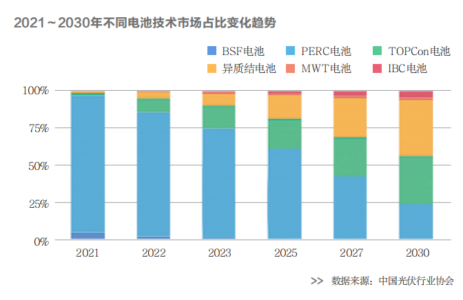 根據(jù)招商證券的統(tǒng)計,2021年PERC電池市占率約為91%,BSF(鋁背場)電池市占率降至5%,N型電池份額僅為3%。但隨著TOPCon電池開始由中試向規(guī)?;l(fā)展,2022年將成為TOPCon技術(shù)的商業(yè)化應用拐點,其性價比逐漸顯示。
