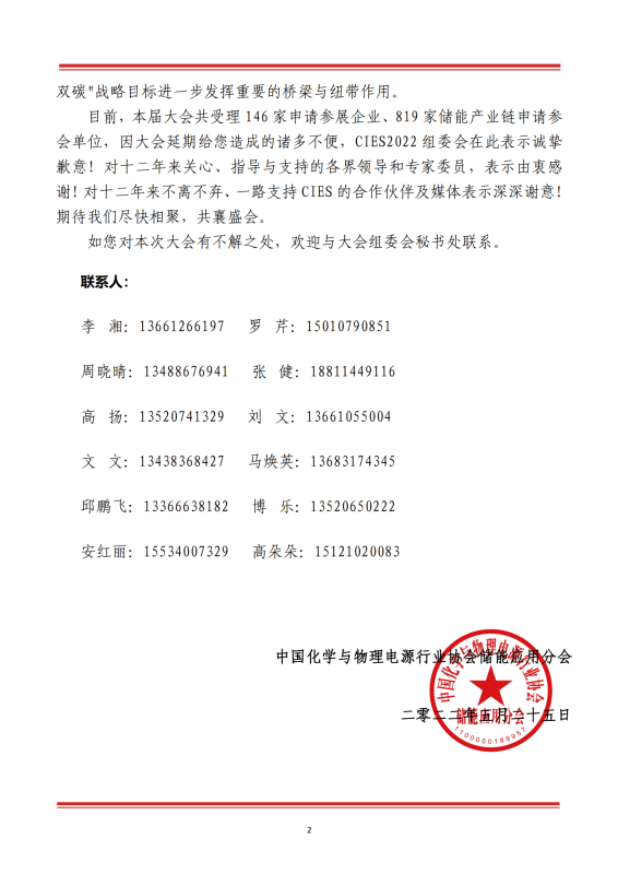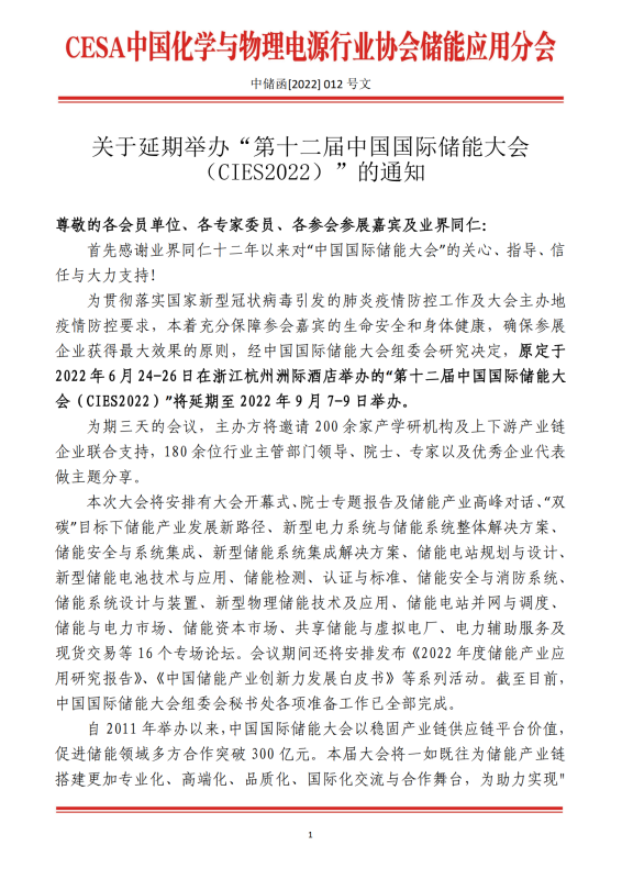 關(guān)于延期舉辦“第十二屆中國(guó)國(guó)際儲(chǔ)能大會(huì)(CIES2022)”的通知