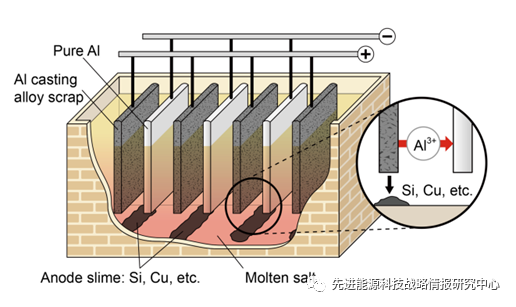 中國儲能網(wǎng)訊:利用重熔技術(shù)回收電池中鋁廢料會降低鋁的品位,而這種降級的再生鋁的最終沉降物是鑄鋁合金。隨著電動汽車廣泛應用,對高等級鋁的需求預計將增加,而低等級再生鋁的需求將下降。為了滿足未來對高品位鋁的需求,需要一種新的鋁回收方法。