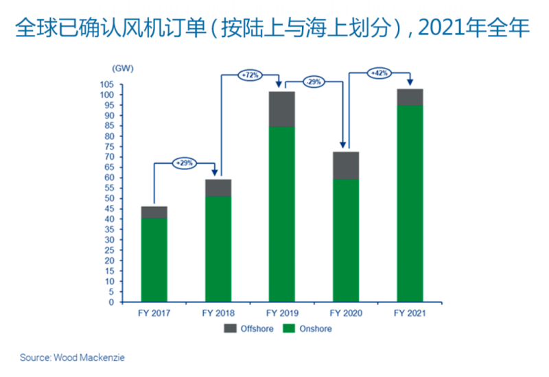 2021年度,全球新增風(fēng)機(jī)訂單總價(jià)值接近570億美元。據(jù)伍德麥肯茲《全球風(fēng)機(jī)訂單分析報(bào)告》,2021年,全球已確認(rèn)風(fēng)機(jī)在手訂單量同比增長(zhǎng)42%,其中,中國(guó)市場(chǎng)的訂單量達(dá)到創(chuàng)紀(jì)錄的55GW,亞太(除中國(guó)大陸外)市場(chǎng)的訂單量則接近9GW,亞太市場(chǎng)訂單量的增長(zhǎng)抵消了全球其余市場(chǎng)因供應(yīng)鏈中斷而導(dǎo)致的訂單量同比減少8%。