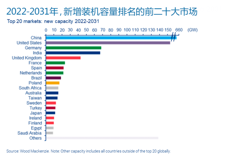 強(qiáng)有力的政策支持將推動(dòng)中國(guó)風(fēng)電市場(chǎng)未來(lái)十年新增657GW并網(wǎng)裝機(jī),其中,海上風(fēng)電新增裝機(jī)將占全球海上風(fēng)電新增裝機(jī)的45%,這也確認(rèn)了其作為全球最大海上風(fēng)電市場(chǎng)的地位。亞太其余地區(qū)市場(chǎng)有望新增132GW并網(wǎng)裝機(jī)容量,近半數(shù)將來(lái)自印度市場(chǎng)。印度政府仍致力于舉辦GW級(jí)國(guó)家風(fēng)電拍賣會(huì),并投資建設(shè)新的輸電線路用于輸送可再生能源電力。
