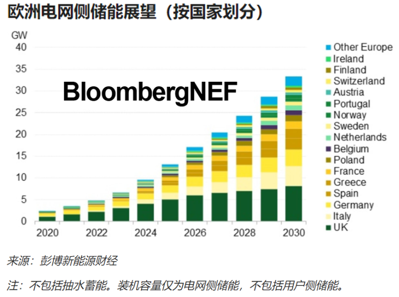 到2030年底,歐洲累計(jì)電網(wǎng)側(cè)儲(chǔ)能裝機(jī)