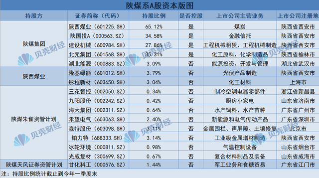 除隆基綠能外,陜煤系在資本市場廣有布局。陜煤集團直接控股四家上市公司,陜西煤業(yè)通過與陜西當?shù)毓蓟鹬烊富鸷献鳎喑霈F(xiàn)在多家上市公司前十大股東之列。