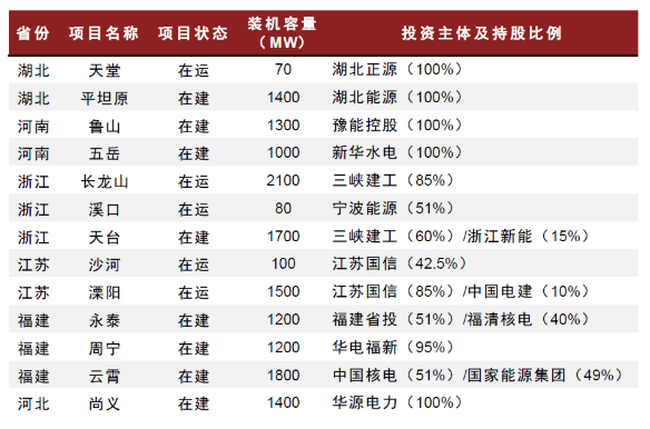 國網(wǎng)新源、南網(wǎng)雙調(diào)仍為最大的抽蓄運營商,發(fā)電企業(yè)裝機容量快速增長。從目前已投運+在建項目來看,發(fā)電企業(yè)投資的抽水蓄能電站數(shù)量占比已達到15%,中廣核集團、三峽集團權(quán)益裝機容量接近3GW(對比國網(wǎng)新源39.4GW、南網(wǎng)雙調(diào)6.7GW)。從投資主體來看,五大電力企業(yè)中華電集團最為積極(控股福建周寧),中廣核、中核等核電企業(yè)均參股或控股抽水蓄能電站,三峽集團旗下三峽重工也積極參與項目投資開發(fā),權(quán)益裝機容量僅次于中廣核集團。