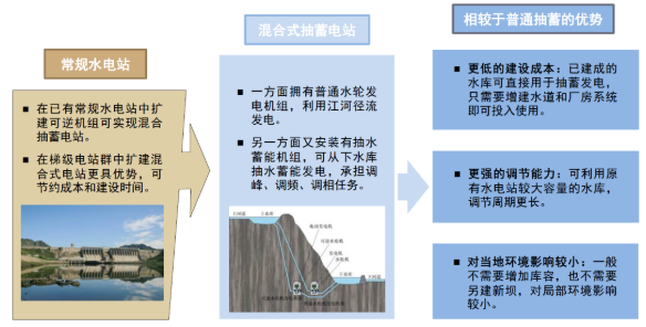 為節(jié)省成本,混合式抽蓄電站有望成為建設(shè)主流?;旌鲜匠樗钅茈娬臼侵?,利用已有的常規(guī)水電站址資源建設(shè)的抽水蓄能電站,具有投資小、建設(shè)周期短、節(jié)省站址資源影響等優(yōu)點。