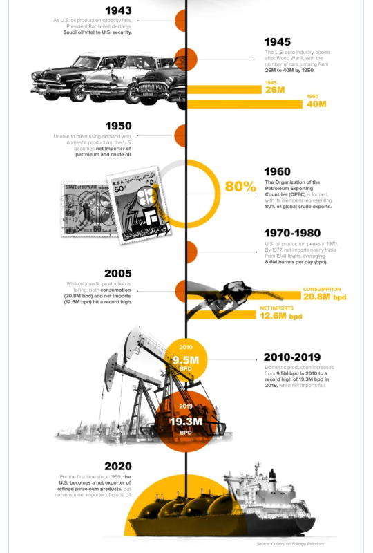 1950年:美國有4000萬輛汽車在路上行駛,成為石油凈進口國,每天需要進口50萬桶石油。