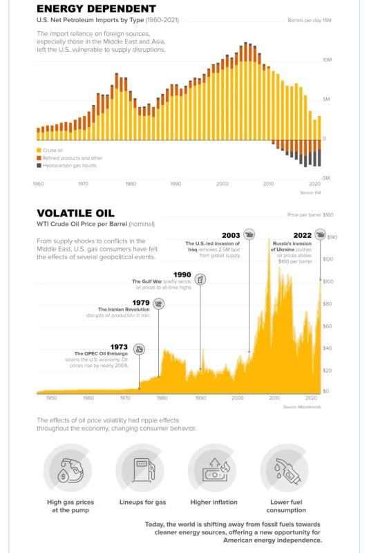 中國儲能網訊:追求能源獨立長期以來一直是美國政治和外交政策的一部分,自20世紀70年代以來更是如此,但美國仍然經常依賴石油進口來滿足其不斷增長的需求。這種“能源對外依賴”使美國和美國消費者很容易受到供應中斷和油價沖擊的影響。Virtutal Capitalist網站發(fā)表信息圖,顯示美國如何能源進口依賴的歷史。