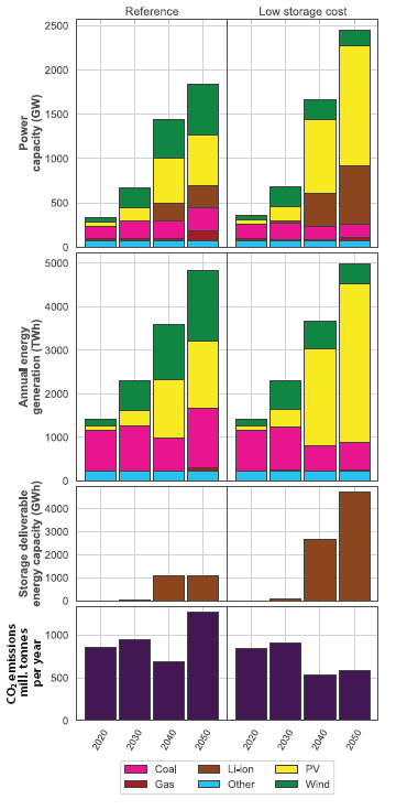 研究表明,依賴燃煤發(fā)電的新興市場和發(fā)展中經(jīng)濟(jì)體無法獲得豐富的低成本天然氣基礎(chǔ)設(shè)施,例如印度代表了儲能技術(shù)電力系統(tǒng)應(yīng)用的一個非常龐大且重要的未來市場。該項(xiàng)研究的建模表明,儲能系統(tǒng)將主要部署在輸電層面,在城市配電網(wǎng)絡(luò)中還有重要的附加應(yīng)用。整體經(jīng)濟(jì)增長(尤其是空調(diào)在印度的迅速普及)將成為儲能部署的主要驅(qū)動力。假設(shè)技術(shù)成本持續(xù)下降,發(fā)現(xiàn)從成本的角度來看,印度的可再生能源發(fā)電設(shè)施在中長期內(nèi)與燃煤發(fā)電廠競爭具有優(yōu)勢,但現(xiàn)有燃煤發(fā)電廠仍然缺乏碳定價,如圖5左側(cè)所示。圖5右側(cè)顯示了假設(shè)印度可以使用低成本儲能系統(tǒng)和可再生能源發(fā)電技術(shù)的場景的建模結(jié)果。這些結(jié)果表明,與基線預(yù)測相比,印度電力系統(tǒng)的系統(tǒng)成本和模擬二氧化碳排放量均顯著降低(見左圖)。無論碳排放是否有上限或稅收,電力系統(tǒng)成本和二氧化碳排放都會降低。這一結(jié)果突出了降低儲能成本的全球環(huán)境效益。