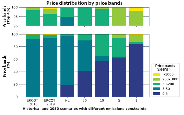 這是因?yàn)?,與目前主要依賴火力發(fā)電設(shè)施的電力系統(tǒng)相比,以可再生能源為主的部署儲能系統(tǒng)的電力系統(tǒng)將具有相對較高的固定投資成本和相對較低的邊際運(yùn)營成本。圖4比較了德克薩斯州電力可靠性委員會(ERCOT)的電力系統(tǒng)中2018年和2019年的每小時批發(fā)電價格分布,該電力系統(tǒng)幾乎覆蓋了德克薩斯州的所有地區(qū),以及2050年的情景。圖中的條形代表無限制和受碳限制的德克薩斯建模案例的價格分布。增加對可再生能源發(fā)電設(shè)施的依賴,邊際成本為零。隨著碳限制變得更加嚴(yán)格(即允許的排放量逐漸降低),這種影響會增加。在價格最高的時段,如柱形頂部和圖中的分解部分所示,模擬價格明顯高于當(dāng)前德克薩斯州電力可靠性委員會(ERCOT)市場的價格。