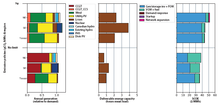 研究團(tuán)隊(duì)對美國電力部門的建模集中在三個地區(qū):東北部地區(qū)(紐約州和新英格蘭地區(qū))、東南部地區(qū)以及德克薩斯州在2050年最新部署的儲能系統(tǒng)。這些地區(qū)在電力需求概況、風(fēng)力發(fā)電和太陽能發(fā)電資源以及水電和現(xiàn)有核電資源的可用性方面存在顯著差異。這些差異會影響在沒有碳排放限制的情況下成本最低的發(fā)電組合以及實(shí)現(xiàn)不同程度脫碳的成本。圖3顯示了2050年每個地區(qū)在兩種政策情景下的年發(fā)電量、可交付能源容量和電力系統(tǒng)電力成本的模擬預(yù)測:無碳限制和排放限制在5克碳排放量/kWh。如果2050年的電力需求與2018年的水平相同,那么將美國電力部門的平均碳強(qiáng)度降低到5克碳排放量/kWh,將使2050年的碳排放量與2005年相比降低99.2%。另一方面,如果2050年用電量增長的需求大于2018年,正如該項(xiàng)研究用于模擬儲能系統(tǒng)影響的電力需求情景中所預(yù)測的那樣。美國各行業(yè)的平均碳排放量與2005年相比,電力部門排放量減少了98.7%。圖3說明結(jié)果來自僅假設(shè)鋰離子電池和抽水蓄能的情景可用,研究團(tuán)隊(duì)對美國地區(qū)的建模評估了廣泛的其他儲能技術(shù)。