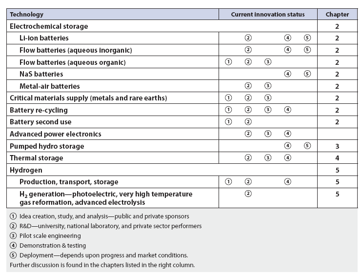 能源技術(shù)和其他與制造相關(guān)的技術(shù)的成功創(chuàng)新通常要經(jīng)過五個階段:創(chuàng)意、研發(fā)、中試、演示和測試、部署。表1展示了各種儲能技術(shù)的當(dāng)前階段。私營企業(yè)為儲能技術(shù)(特別是用于汽車的鋰離子電池)提供了大量風(fēng)險投資。正如這個研究項(xiàng)目中所討論的那樣,電動汽車電池的開發(fā)顯著地改善了電池儲能系統(tǒng)在電力系統(tǒng)的采用。到目前為止,長時儲能技術(shù)還沒有得到其他市場驅(qū)動因素的類似幫助。當(dāng)可變可再生能源(VRE)滲透率較低時,長時儲能系統(tǒng)(持續(xù)時間大于12小時)的應(yīng)用價值較低,但隨著脫碳要求變得更加嚴(yán)格和對可變可再生能源(VRE)發(fā)電的依賴增加時,長時儲能技術(shù)顯然變得更有價值。如果電網(wǎng)運(yùn)營商在淘汰天然氣燃料發(fā)電設(shè)施(有或沒有碳捕獲和儲存)的情況下尤其如此。長時儲能系統(tǒng)在高度脫碳的電力系統(tǒng)中所能提供的價值表明,政府部門應(yīng)根據(jù)不同技術(shù)所達(dá)到的創(chuàng)新階段,并加大對各種長時儲能系統(tǒng)的支持力度。