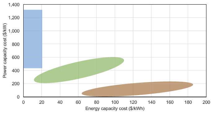 該報告中考慮的技術(shù)根據(jù)其電力和能源容量成本分為三大類(見圖1)。一般來說,儲能容量成本較低和裝機(jī)容量成本高(圖中藍(lán)色區(qū)域)的儲能技術(shù)最適合作為長時儲能(持續(xù)時間最多可達(dá)數(shù)天),這些儲能技術(shù)的充放電不太頻繁,例如熱儲能、化學(xué)儲能、金屬空氣電池和抽水蓄能設(shè)施等。而棕色區(qū)域的儲能技術(shù)(其中包括鋰離子電池儲能系統(tǒng)),更適合持續(xù)時間較短的儲能應(yīng)用(持續(xù)時間為幾個小時)和更頻繁的充放電。具有中等能力的儲能技術(shù)(包括液流電池)處于綠色區(qū)域。