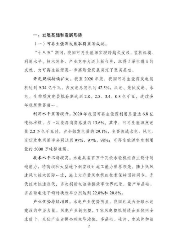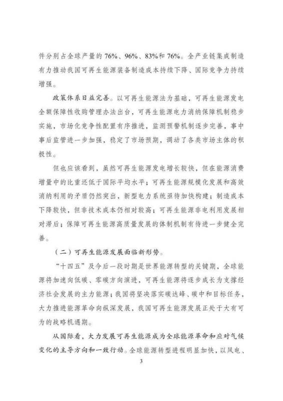 為深入貫徹“四個革命、一個合作”能源安全新戰(zhàn)略,落實(shí)碳達(dá)峰、碳中和目標(biāo),推動可再生能源產(chǎn)業(yè)高質(zhì)量發(fā)展,根據(jù)《中華人民共和國國民經(jīng)濟(jì)和社會發(fā)展第十四個五年規(guī)劃和2035年遠(yuǎn)景目標(biāo)綱要》和《“十四五”現(xiàn)代能源體系規(guī)劃》有關(guān)要求,我們組織編制了《“十四五”可再生能源發(fā)展規(guī)劃》。現(xiàn)印發(fā)給你們,請遵照執(zhí)行。