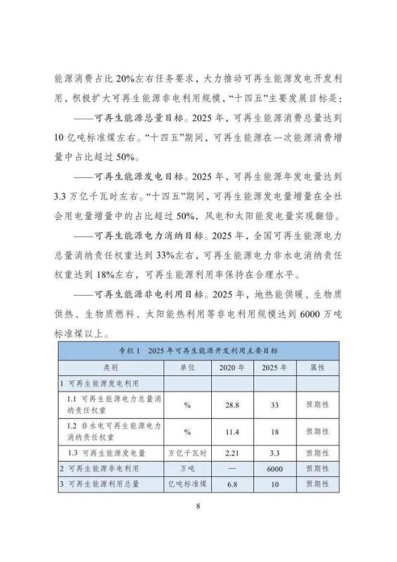 ——可再生能源總量目標(biāo)。2025年,可再生能源消費(fèi)總量達(dá)到10億噸標(biāo)準(zhǔn)煤左右?!笆奈濉逼陂g,可再生能源在一次能源消費(fèi)增量中占比超過50%。