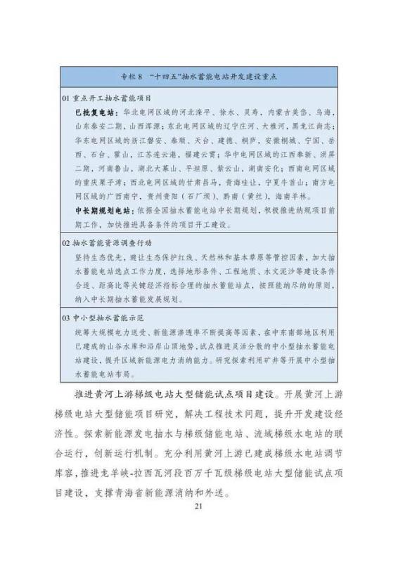 1、開展黃河上游梯級電站大型儲能項(xiàng)目研究,解決工程技術(shù)問題,提升開發(fā)建設(shè)經(jīng)濟(jì)性。探索新能源發(fā)電抽水與梯級儲能電站、流域梯級水電站的聯(lián)合運(yùn)行,創(chuàng)新運(yùn)機(jī)制。充分利用黃河上游已建成梯級水電站調(diào)節(jié)庫容,推進(jìn)龍羊峽-拉西瓦河段百萬千瓦級梯級電站大型儲能試點(diǎn)項(xiàng)目建設(shè),支撐青海省新能源消納和外送。