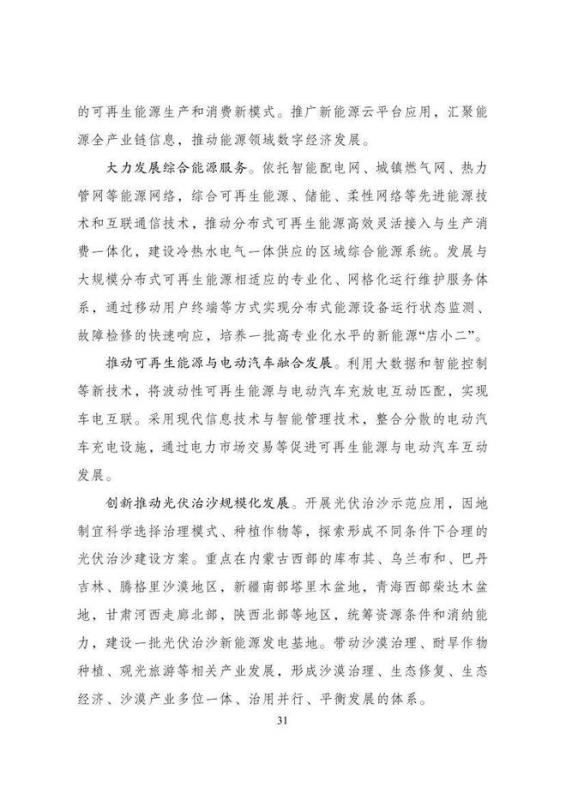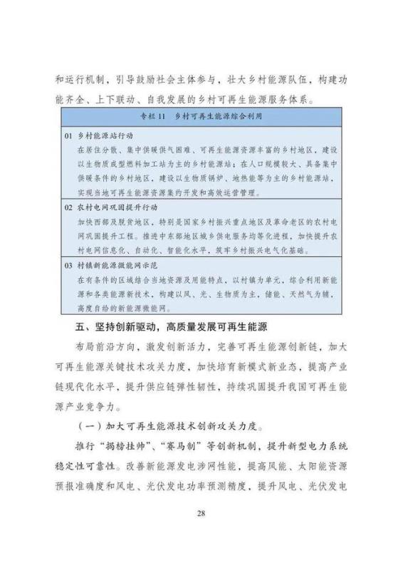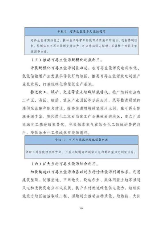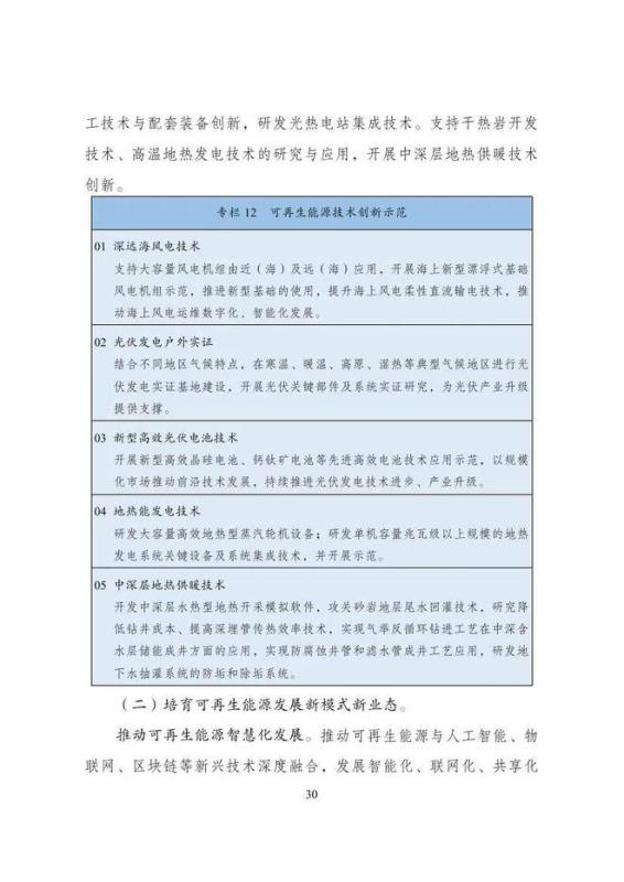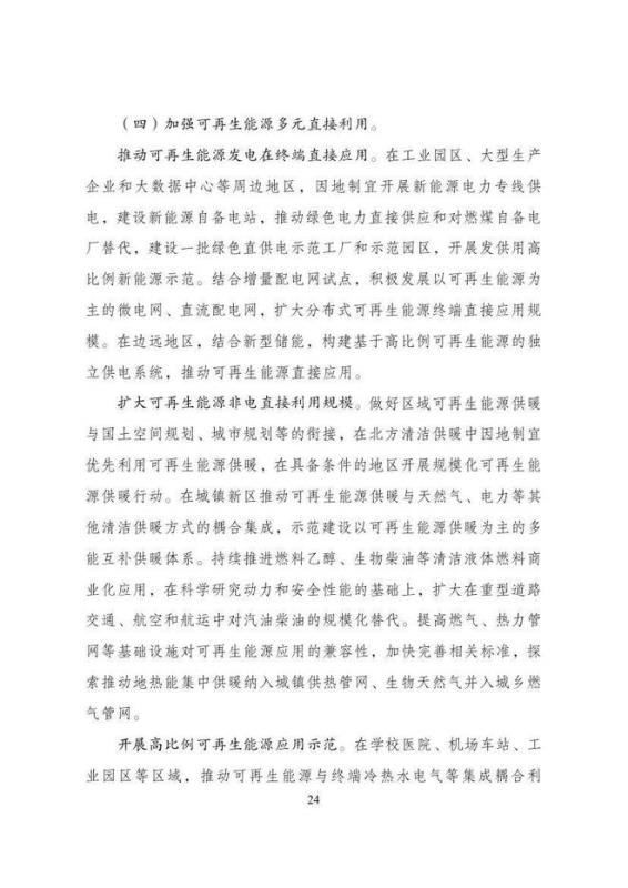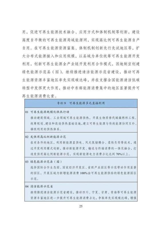5、在學(xué)校醫(yī)院、機(jī)場車站、工業(yè)園區(qū)等區(qū)域,推動可再生能源與終端冷熱水電氣等集成耦合利用,促進(jìn)可再生能源技術(shù)融合、應(yīng)用方式和體制機(jī)制等創(chuàng)新,建設(shè)高度自平衡的可再生能源局域能源網(wǎng),實(shí)現(xiàn)高比例可再生能源自產(chǎn)自用。在可再生能源資源富集、體制機(jī)制創(chuàng)新先行先試地區(qū)等,擴(kuò)大分布式能源接入和應(yīng)用規(guī)模,以縣域?yàn)閱挝唤y(tǒng)籌可再生能源開發(fā)利用,創(chuàng)新可再生能源全產(chǎn)業(yè)鏈開發(fā)利用合作模式,因地制宜創(chuàng)建綠色能源示范縣(園)。繼續(xù)推進(jìn)清潔能源示范省建設(shè),推動可再生能源資源豐富地區(qū)率先實(shí)現(xiàn)碳達(dá)峰,并在支撐全國能源清潔低碳轉(zhuǎn)型中發(fā)揮更大作用,推動中東部能源消費(fèi)集中的地區(qū)顯著提升可再生能源消費(fèi)比重。