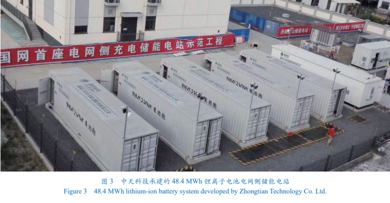 鋰離子電池在電力系統(tǒng)中另一大應(yīng)用在電網(wǎng)側(cè)。在變電站配套儲能系統(tǒng)、通過電網(wǎng)的智能調(diào)度來實(shí)現(xiàn)削峰填谷,延緩電網(wǎng)的投資及提高電網(wǎng)主動調(diào)節(jié)能力。2016年,美國加利福尼亞州緊急開展 100 MW的鋰離子電池儲能實(shí)施計(jì)劃,以應(yīng)對電力短缺問題。該電池系統(tǒng)主要用于在白天儲存加利福尼亞州光伏電站資源發(fā)出的電力;在太陽落山后,儲能系統(tǒng)被調(diào)度將電力釋放給電網(wǎng)。2017年 1月,美國特斯拉公司為南加利福尼亞州愛迪生公司的 Mira Roma變電站建成了輸出功率 20 MW、總?cè)萘?80 MWh的鋰離子儲能系統(tǒng),該系統(tǒng)成為當(dāng)時(shí)全球最大的電池儲能系統(tǒng)。隨后在 2017年 2月,AES公司采用三星公司的鋰離子電池為圣迭戈煤氣電力公司(SDG&E)在加利福尼亞州 Escondido市部署了輸出功率 30 MW、總?cè)萘?120 MWh的儲能系統(tǒng)。該項(xiàng)目 30 MW鋰離子儲能系統(tǒng)全部在 6個月內(nèi)并網(wǎng)投運(yùn),這不僅推動儲能成了未來應(yīng)對電網(wǎng)危機(jī)的重要解決方案,也為利用分布式儲能滿足當(dāng)?shù)仉娏θ萘啃枨筇峁┝藦?qiáng)有力的支撐。2021年 7月,英荷殼牌石油公司宣布 100 MW儲能電站全面投入運(yùn)營,這是歐洲目前最大規(guī)模的儲能電站;其位于英國西南部威爾特郡附近,由 2個裝機(jī)容量均為 50 MW/50 MWh的電池儲能設(shè)施構(gòu)成,采用磷酸鐵鋰/三元鋰電池技術(shù)。2018年,為解決國電諫壁發(fā)電廠 3臺 330 MW發(fā)電機(jī)組退役后帶來的電力缺口問題,中國國家電網(wǎng)江蘇省電力有限公司利用丹陽、揚(yáng)中、鎮(zhèn)江等地 8處退役變電站場地,緊急建設(shè)鎮(zhèn)江儲能電站工程,充分發(fā)揮儲能設(shè)備建設(shè)周期短、配置靈活、響應(yīng)速度快等優(yōu)勢,有效緩解了供電壓力。該電網(wǎng)側(cè)儲能項(xiàng)目采用“分散式布置集中式控制”方式,建設(shè)了 8個儲能電站項(xiàng)目,全部采用磷酸鐵鋰電池技術(shù),規(guī)模共計(jì) 101 MW/202 MWh。該儲能電站于 2018年 7月 18日正式并網(wǎng)投運(yùn)。2020年度,江蘇中天科技股份有限公司承建的全球最大的電網(wǎng)側(cè)儲能電站江蘇二期昆山 48.4 MWh儲能電站投入運(yùn)營(圖 3);該公司承建的國家“863計(jì)劃”重點(diǎn)研發(fā)項(xiàng)目——動力電池規(guī)?;荽卫霉こ虄δ茈娬緞t是全國最大的用戶側(cè)梯次利用儲能電站項(xiàng)目,亦于2020年末投入試運(yùn)行。