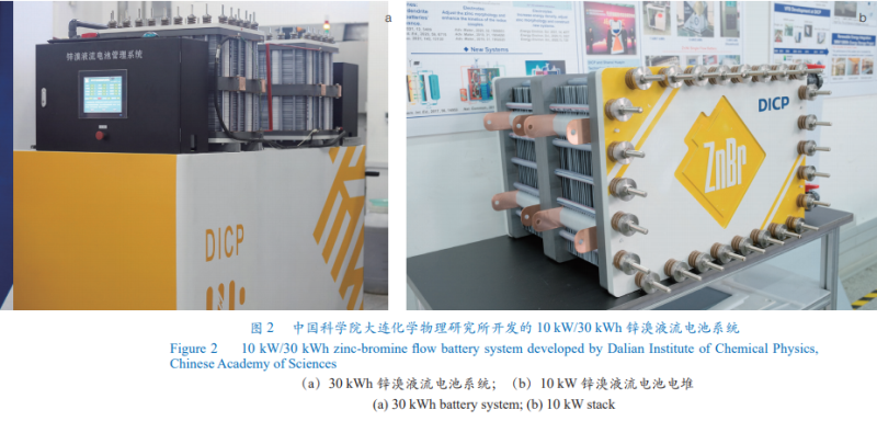 鋅溴液流電池生產(chǎn)企業(yè)主要有澳大利亞的Redflow、美國的 ZBB和 Primus Power、韓國的樂天化學(xué),以及中國的安徽美能和百能匯通等公司。鋅鐵液流電池的生產(chǎn)企業(yè)主要有美國的 ViZn公司、中國的中國電建集團(tuán)江西省電力建設(shè)有限公司。Redflow公司推出的小型家用光伏發(fā)電鋅溴液流電池儲能系統(tǒng)(5kW/10 kWh)已在澳大利亞、新西蘭、美國等地成功實(shí)施。2022年大連化物所成功開發(fā)出 10 kW/30 kWh用戶側(cè)鋅溴液流電池系統(tǒng)(圖 2)。該系統(tǒng)的成功開發(fā),將進(jìn)一步推動用戶側(cè)新型鋅基液流電池的發(fā)展與產(chǎn)業(yè)化應(yīng)用,對于推動鋅基液流電池可持續(xù)發(fā)展具有重要意義。