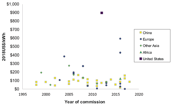 圖3.2和3.3顯示了抽水蓄能設(shè)施在裝機(jī)容量(kW)和儲(chǔ)能容量(kWh)的建設(shè)成本。1995年以來,世界主要國家和地區(qū)總體部署趨勢(shì)平穩(wěn)。而不同項(xiàng)目和不同國家的成本差異很大。