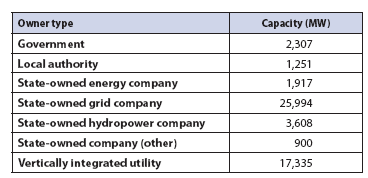 表3.3顯示了全球1999~2019年期間投產(chǎn)的抽水蓄能裝機(jī)容量,按業(yè)主類型細(xì)分。國有實(shí)體、垂直整合的公用事業(yè)、政府和地方當(dāng)局在此期間啟動(dòng)了所有項(xiàng)目。中國在建設(shè)抽水蓄能項(xiàng)目方面占據(jù)全球主導(dǎo)地位,還有其他一些國家的抽水蓄能設(shè)施裝機(jī)容量增長相對(duì)較快,例如西班牙和葡萄牙。