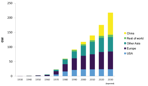 圖3.1世界各地的抽水蓄能設(shè)施裝機容量的增長增況