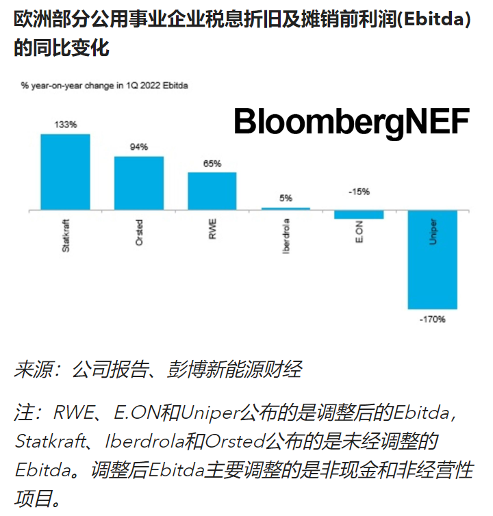 史無前例的歐洲高電價引發(fā)了人們的擔憂,尤其是政界人士擔心能源公用事業(yè)公司可能會收獲過高的利潤。意大利和西班牙等一些歐洲國家已經(jīng)通過超額利潤稅收機制進行干預(yù),對超額利潤施以上限。詳情請閱讀《西班牙再次干涉清潔能源利益(Spain Extends Its Claws Into Clean Energy Profits Again)》。對于一家沒有對沖、專注于發(fā)電,且發(fā)電資產(chǎn)組合中幾乎沒有天然氣發(fā)電的企業(yè)來說,當前的高電價確實可能帶來豐厚的利潤。但是,公用事業(yè)公司的業(yè)務(wù)結(jié)構(gòu)明顯更為復(fù)雜,涉及從發(fā)電到交易和零售的整個電力價值鏈。2022年一季度的財報充分體現(xiàn)了這種復(fù)雜性:一些公用事業(yè)公司的稅息折舊及攤銷前利潤(Ebitda)翻了一番,而另一些則出現(xiàn)了虧損。理解獲利與虧損的背后原因,對于理解當前的危機可能如何影響整個公用事業(yè)行業(yè)非常重要。