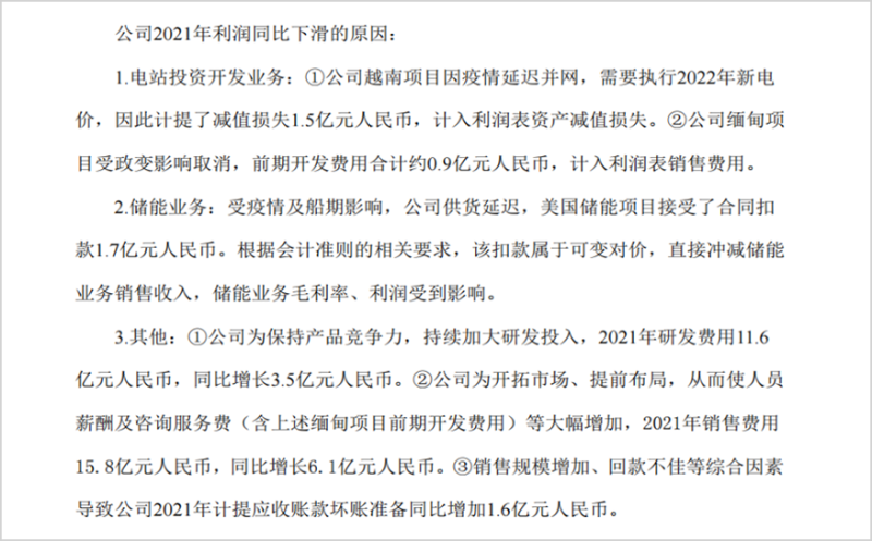 因?yàn)橐咔椋侥享?xiàng)目延遲了交付,儲能業(yè)務(wù)也繳納了罰款,同時(shí)還包括緬甸政變不可抗力、匯兌損失、應(yīng)收賬款壞賬準(zhǔn)備、研發(fā)和銷售費(fèi)用大增等。據(jù)財(cái)報(bào)公布后的業(yè)績說明會顯示,對凈利潤的影響大約有10億元。