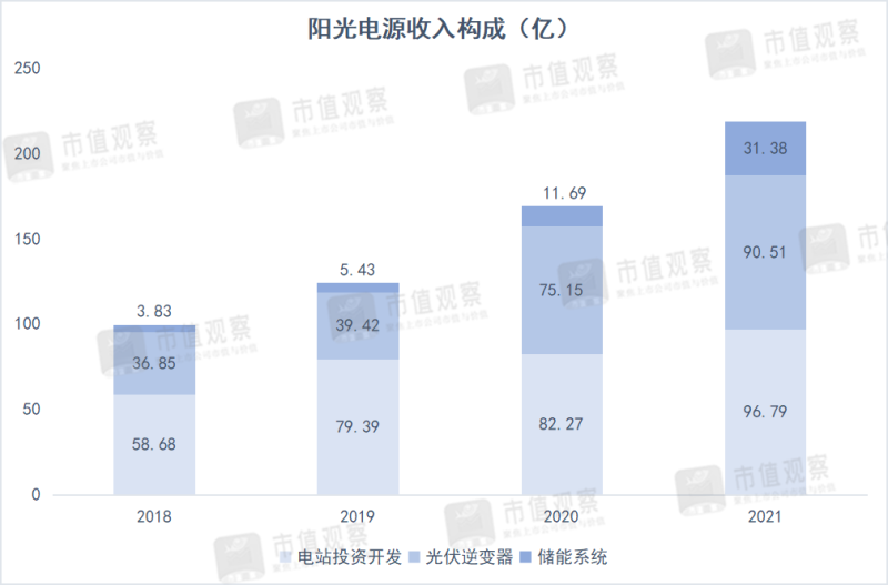 陽光電源的業(yè)務(wù)主要分為三部分:光伏電站開發(fā)、逆變器和儲能,另外還包括風(fēng)電變流器等其他項(xiàng)目,占比較小。當(dāng)下電站增長已經(jīng)放緩,支撐業(yè)績增長的主要是逆變器和儲能。