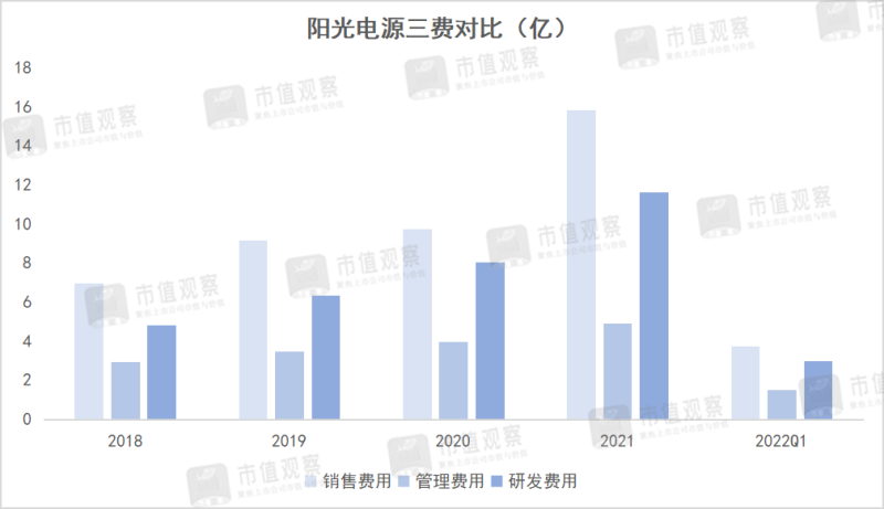 步調(diào)太大典型的就是三費(fèi)。數(shù)據(jù)顯示,2021年陽光電源全年銷售費(fèi)用達(dá)15.83億,同比增長62.69%;研發(fā)費(fèi)用為11.61億,同比增長44%;管理費(fèi)用4.91億,同比23.99%。