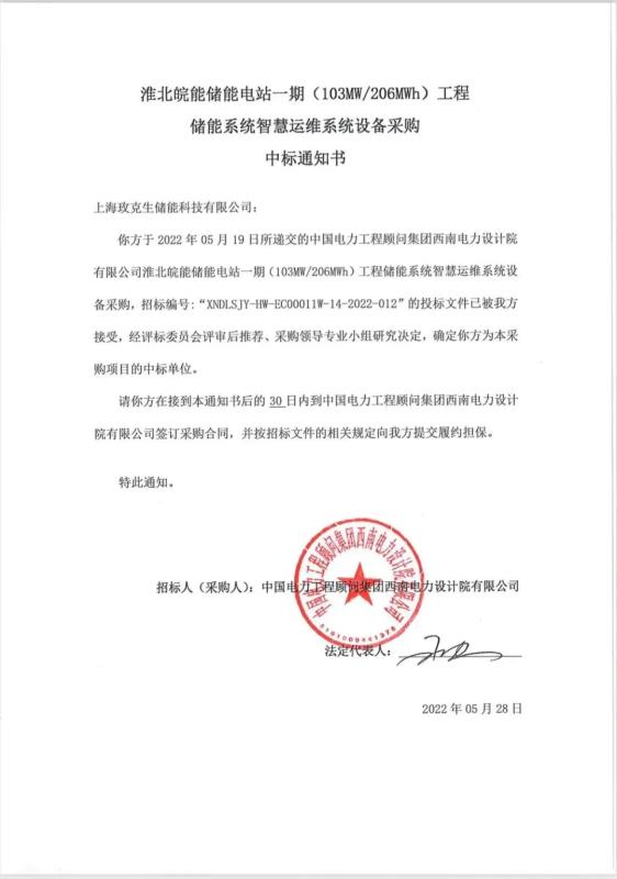 儲能系統(tǒng)智慧運維系統(tǒng)設備采購中標通知書