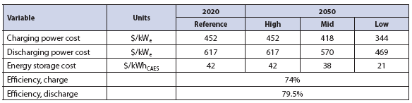 盡管如此,可以開發(fā)出高、中、低成本的估算值,并與報告的數(shù)字進行比較。例如,天然氣發(fā)電廠和熱儲能系統(tǒng)的成本信息可用于分別估算CAES系統(tǒng)電力和能源容量的參考成本。由于CAES系統(tǒng)的地上部件(如壓縮機、膨脹機和熱交換器)技術(shù)成熟,它們的成本可以給定的工廠進行估計??梢允褂脕碜跃酃馓柲軕?yīng)用的數(shù)據(jù)以一定的準(zhǔn)確度估算低溫和中溫蓄熱的成本。高溫儲存(600℃以上)的成本更不確定。大部分剩余的不確定性CAES成本來自空氣儲能成本的不確定性。