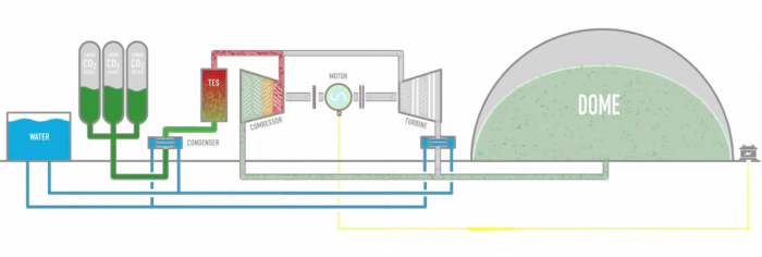 Energy Dome的電池使用巨大的穹頂,其中有巨大的、靈活的囊袋,里面充滿了二氧化碳?xì)怏w。它通過(guò)使用能量來(lái)運(yùn)行電動(dòng)壓縮機(jī),將氣體擠壓成越來(lái)越小的體積,最終將其冷凝成液體,在環(huán)境溫度下儲(chǔ)存,從而為電池“充電”。這個(gè)充電過(guò)程產(chǎn)生廢熱,并被收集到熱能儲(chǔ)存系統(tǒng)中。