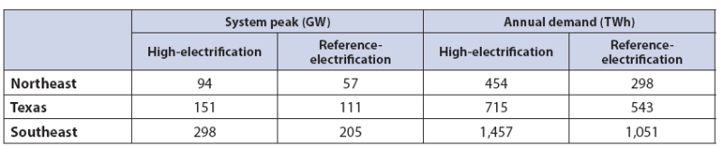 如上所述,在基本案例中使用美國國家可再生能源實驗室(NREL)電氣化未來研究 (EFS)中的高電氣化負載情景,以反映2050年在經(jīng)濟范圍內(nèi)實現(xiàn)深度脫碳所需的電氣化水平。與參考情景相比,高電氣化負荷情景假設(shè)電力在滿足最終能源需求方面的作用增加(目前的41%與2050年的23%)。由于當(dāng)?shù)靥鞖鈼l件和電氣化潛力,將會出現(xiàn)區(qū)域差異。例如,與美國國家可再生能源實驗室(NREL)電氣化未來研究 (EFS)參考負荷情景案例相比,高電氣化負荷情景在美國東北地區(qū)的系統(tǒng)峰值高出65%,年需求高出52%。。在高電氣化情景下,美國東北地區(qū)冬季用電量增長最為顯著,因為通過寒冷氣候熱泵實現(xiàn)電氣化空間供暖的作用更大。這部分解釋了與德克薩斯州相比,電氣化(高與參考情景)對東北部峰值和年度電力需求的更大影響(表6.6)。