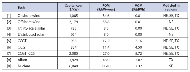 根據(jù)研究團隊的建模假設(shè),將投資限制在以下技術(shù):公用事業(yè)規(guī)模的太陽能發(fā)電設(shè)施和陸上風(fēng)電設(shè)施(以及美國東北部的海上風(fēng)電和分布式太陽能設(shè)施);天然氣發(fā)電廠(開式循環(huán)燃氣輪機(OCGT)和聯(lián)合循環(huán)燃氣輪機(CCGT));采用或不采用基于胺的碳捕獲和儲存(CCS)技術(shù);發(fā)揮重要作用的水電設(shè)施(美國東北部和東南部)。研究團隊并不認為燃煤發(fā)電在2050年在美國是一種可行的發(fā)電技術(shù),這是因為燃煤發(fā)電的成本競爭力下降,在美國電力結(jié)構(gòu)中的作用逐漸減弱,并且具有更高的碳排放。新建模型的例外是美國東北部和東南部現(xiàn)有的水電設(shè)施和抽水蓄能發(fā)電設(shè)施,美國東南部現(xiàn)有的核電設(shè)施在2050年仍可運行,假設(shè)其工作壽命為80年,以及美國東北部和東南部現(xiàn)有輸電能力。如下所述,將德克薩斯州建模為單個輸電區(qū)域。在獨立的區(qū)域案例研究中,還評估了新的核能和新興天然氣發(fā)電技術(shù)與碳捕獲和儲存(CCS)技術(shù)和工業(yè)用氫的影響。