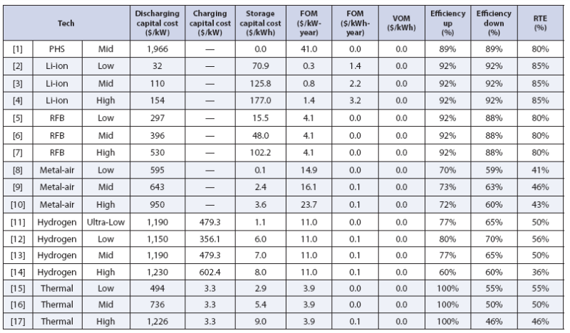 在GenX模型中,根據(jù)儲能技術(shù)的設(shè)計以及假定的成本和性能特征進行區(qū)分。在設(shè)計方面,GenX包含兩種廣泛的儲能技術(shù)。第一類包括充電和放電容量相等的技術(shù)(例如鋰離子電池或液流電池、抽水蓄能);對于這些技術(shù),儲能容量和充電/放電裝機容量是兩個獨立的設(shè)計變量,并且可以指定儲能容量與裝機容量的可行范圍。第二類包括充電功率和放電功率的技術(shù),以及儲能容量,這些都是獨立的設(shè)計變量(例如熱儲能或氫氣儲能)。根據(jù)這一分類,儲能技術(shù)的特征在于一個、兩個或三個獨立的資本和固定運營和維護成本參數(shù)(表6.2)。對于儲能容量是獨立設(shè)計變量的儲能技術(shù),研究團隊將持續(xù)時間(儲能容量與裝機容量之比)限制為小于300小時,但這一限制不會對此處報告的結(jié)果具有約束力。此外,由于數(shù)據(jù)限制,對具有固定儲能時間(12小時)的抽水蓄能進行建模,并假設(shè)總資本成本僅與電力容量成比例。