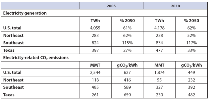 具體來說,研究團隊分析了美國三個地區(qū)(美國東北部、東南部和德克薩斯州)以及國家層面的電力系統(tǒng)的演變,但細節(jié)較少。在2005年至2018年期間,所有這些地區(qū)以及美國各地都經(jīng)歷了發(fā)電產(chǎn)生的碳排放量顯著減少。這些減少反映了電力需求停滯的綜合影響;大量減少燃煤發(fā)電轉(zhuǎn)而使用天然氣發(fā)電,主要是出于經(jīng)濟原因;可變可再生能源 (VRE)發(fā)電量顯著增加,主要是(但不完全)由公共政策推動。盡管有這些趨勢,化石燃料發(fā)電設(shè)施仍然是美國能源相關(guān)碳排放的主要來源,約占2018年美國能源相關(guān)碳排放總量的31%。