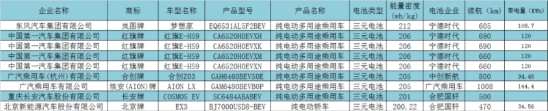 高工鋰電梳理2021-2022年已發(fā)布的《新能源汽車推廣應(yīng)用推薦車型目錄》發(fā)現(xiàn),目前已有東風(fēng)、一汽、廣汽、長(zhǎng)安、北汽等多家主機(jī)廠申報(bào)了搭載系統(tǒng)能量密度超過(guò)200Wh/kg的純電動(dòng)車型,配套電池企業(yè)為寧德時(shí)代、中創(chuàng)新航和國(guó)軒高科。