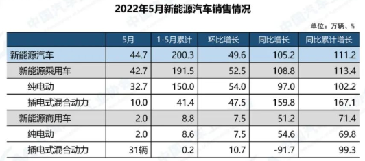 6月10日,中汽協(xié)發(fā)布數(shù)據(jù),2022年1-5月我國(guó)新能源汽車?yán)塾?jì)產(chǎn)量207.1萬輛,同比增長(zhǎng)114.2%;銷量200.3萬輛,同比增長(zhǎng)111.2%。