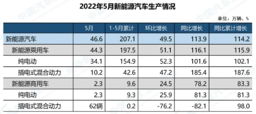 其中5月,新能源汽車產(chǎn)量46.6萬輛,環(huán)比增長(zhǎng)49.5%,同比增長(zhǎng)113.9%;銷量44.7萬輛,環(huán)比增長(zhǎng)49.6%,同比增長(zhǎng)105.2%。