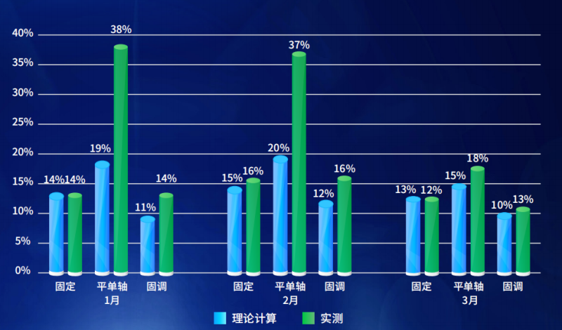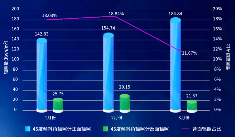 從輻射數(shù)據(jù)來看,第一季度主要為雪地應(yīng)用場景,背面輻照占比較高,傾斜面平均達(dá)到15.85%;1月和2月主要為雪地,背面輻照占比較高,3月份隨著積雪融化,應(yīng)用場景為土地,背面輻照占比下降明顯。