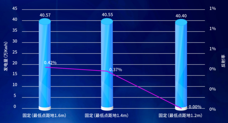 鑒于目前各地區(qū)對(duì)于光伏復(fù)合項(xiàng)目要求中支架高度越來越高,從大慶基地的數(shù)據(jù)發(fā)現(xiàn),距地1.6m發(fā)電量最高,分別較距地1.4m和1.2m高0.05%、0.42%。不同距地高度正面輻照差異較小,但不同距地高度背面輻照差異較大,距地高度越低,背面輻照越小,背面輻照占比越低。